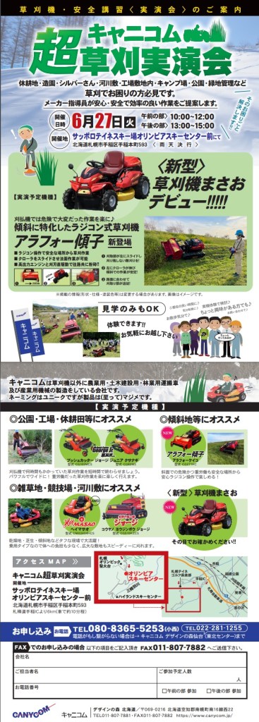 6月27日、サッポロテイネスキー場オリンピアスキーセンター前にてキャニコム超草刈り実演会が開催されます。